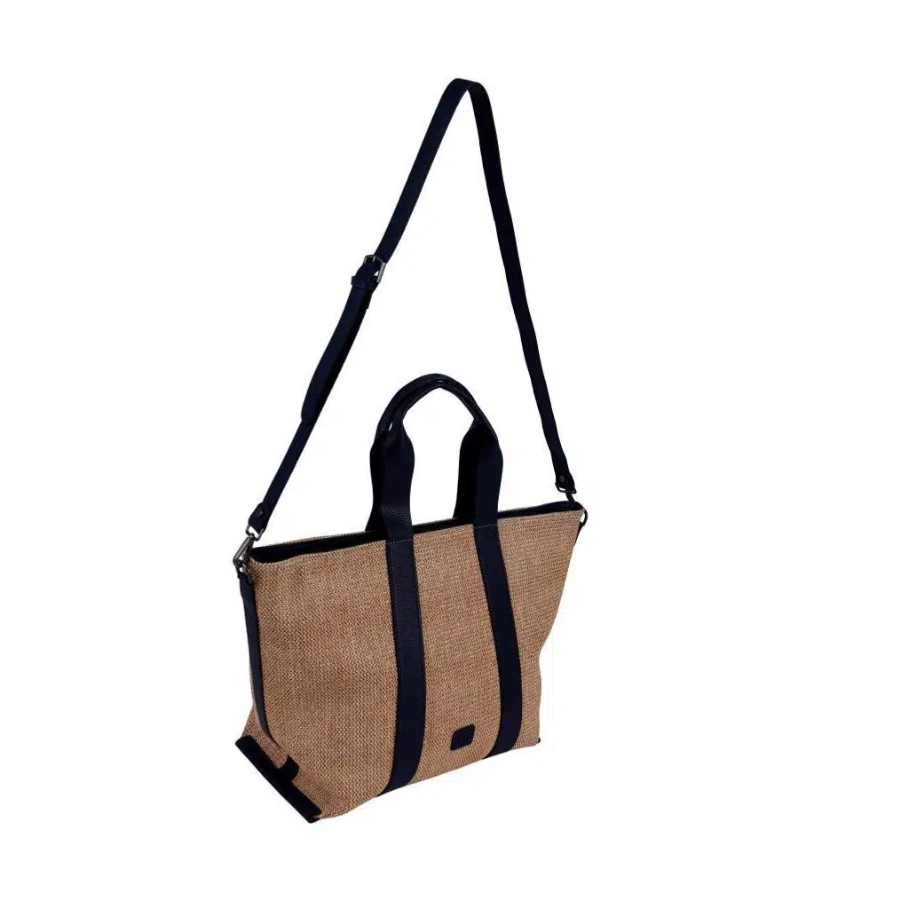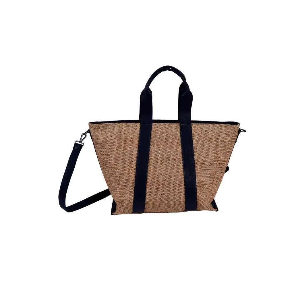 Hasır dokusu çantaya doğal bir hava katarken lacivert vegan deri detayları ile asil çizgiler çantanın kalite ve tasarımını öne çıkarmaktadır.