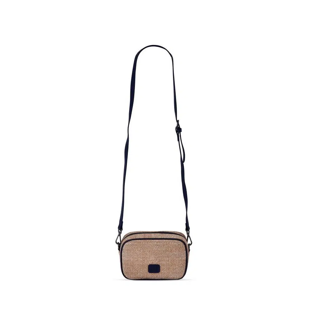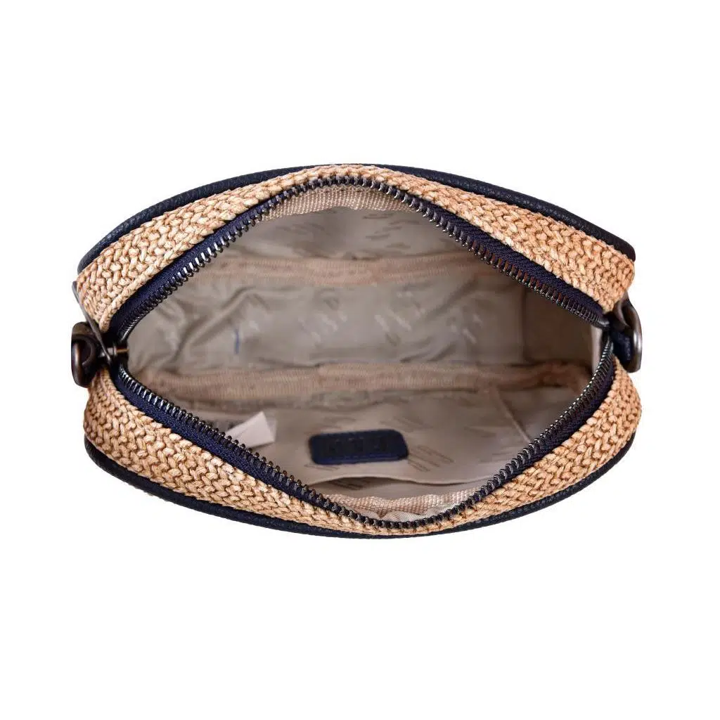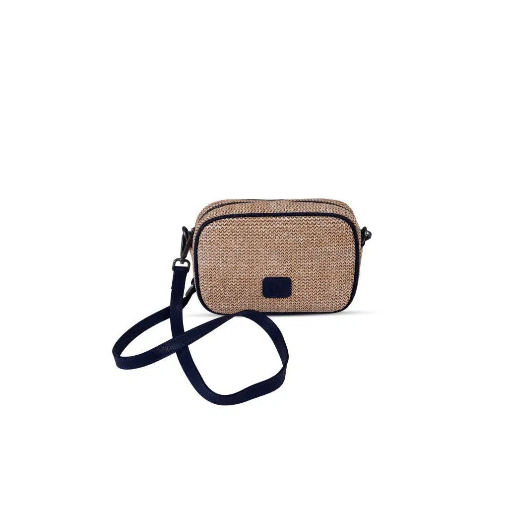 Hasır dokusu çantaya doğal bir hava katarken lacivert vegan deri detayları ile asil çizgiler çantanın kalite ve tasarımını öne çıkarmaktadır.