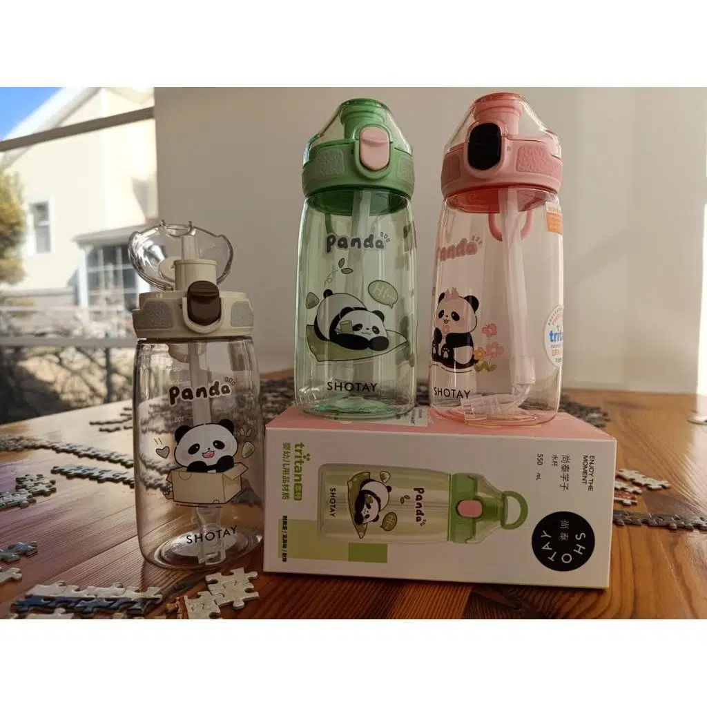 Shotay Child Çocuk Su Matarası Sızdırmaz, Kilitli Kapak, Dayanıklı, Kulplu, Pipetli ve Emzikli, BPA İçermeyen, Tritan Unisex Çocuk Panda Siyah 550Ml